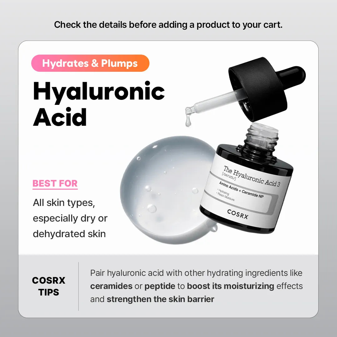 Pair Hyaluronic Acid with other hydrating ingredients like Ceramides or Peptide to boost its moisturizing effects and strengthen the skin barrier.