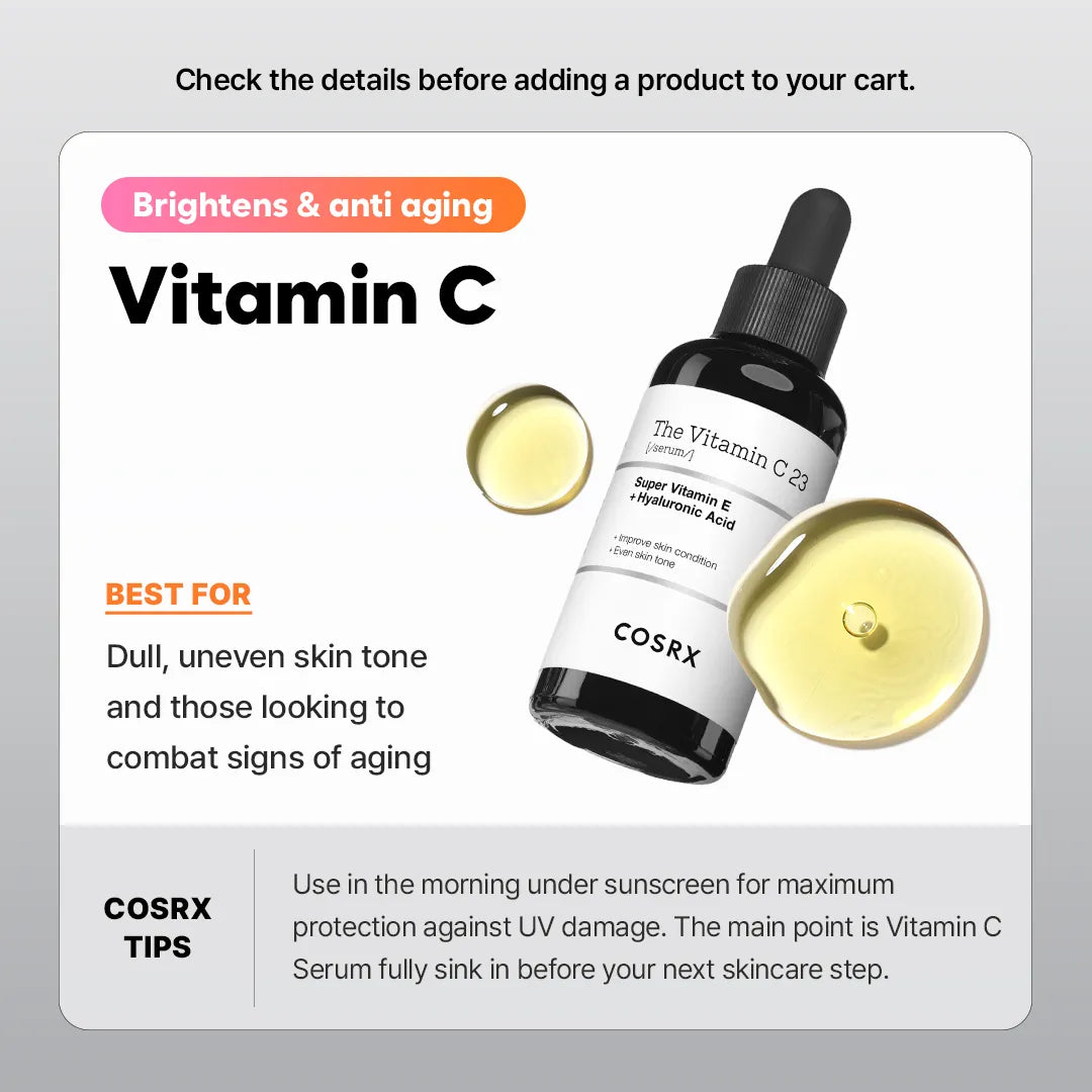 When used in the morning, apply under sunscreen for optimal UV damage protection. It is crucial for the Vitamin C Serum to fully absorb before moving on to the next skincare step.