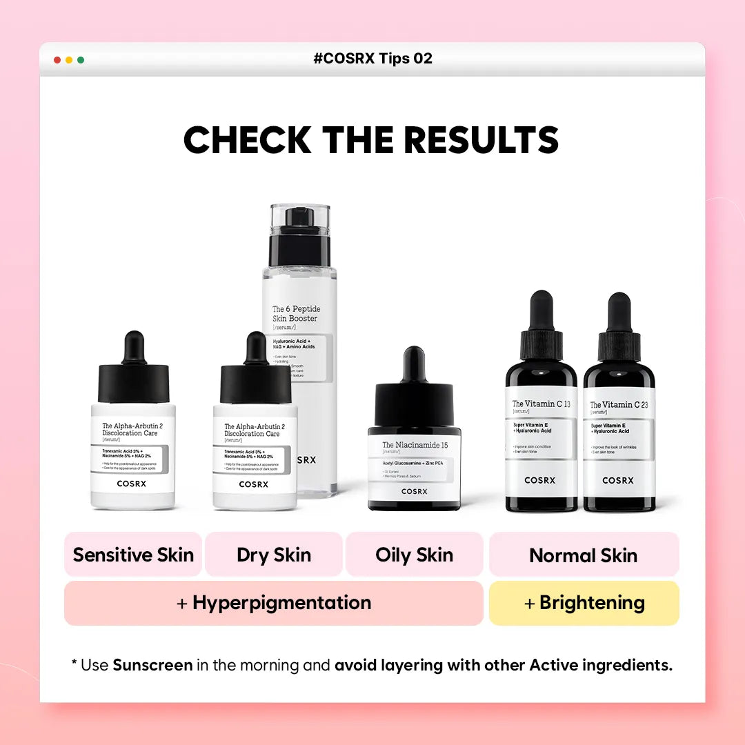 If you have sensitive skin, try the Alpha-Arbutin Serum. For dry skin, pair it with the Peptide Serum. Niacinamide is ideal for oily skin. Vitamin C is a simple choice for all.